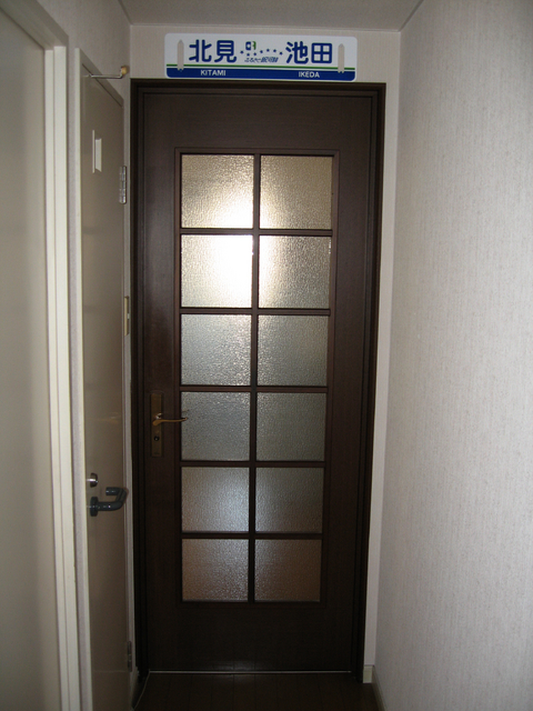 …そして,装着してみたのがこの図。いや,思ったより大きかったのですよ〜(そりゃ表示板だからな^ ^;;)。置き場所をアレコレ探してみたところ,ちょうど扉の上の空間にいい具合に収まったので,画びょうで固定してみました。