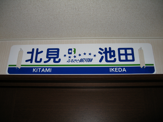 先日乗りに行ったふるさと銀河線@北海道ちほく高原鉄道のホームページ上で行先表示板(未使用らしい)なるものが売られていたので,つい買ってしまった(^ ^;)。送られてきた荷物の宛名ラベルにも“行先表示板”と書かれていたけど,配達のおにーさんは何だコリャと思ったでしょうな(笑)。
