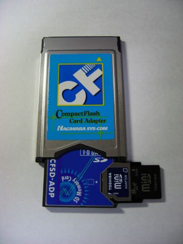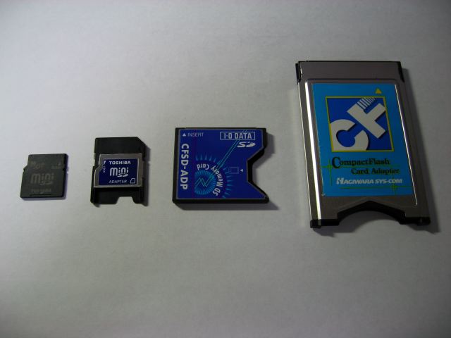 左から,miniSDカード,miniSDカードアダプタ,SDカードアダプタ,CFカードアダプタ。