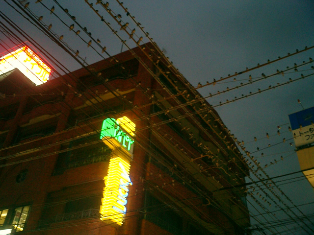 昨日の夕方,用事があって普段寄らない駅の周辺【リンク】に行ったら,すさまじい数のスズメ(?)が電線の上でピーピー鳴いているのを目撃し,驚いてしまいました。このあたりの住民にとっては当たり前の光景なのかも知れないけど…ここまでくるとコワイですな。数匹ならかわいいで済むかも知れないけど,数千羽(ぐらいいると思われる)が一カ所に群れていると,鳴き声はやかましいし,頭上攻撃も矢の如しでタマランです(^ ^;;)。まるでヒッチコックの世界ですね,ここは。