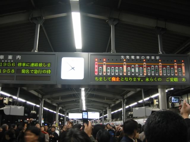 9時頃に羽田へ着き,それから新宿→秋葉原(交通博物館【リンク】)→青海(日本未来科学館【リンク】)→恵比寿(東京都写真美術館【リンク】)→新宿…と回ることに。何で3つも博物館(美術館)を巡ったかというと,交通博物館(面白いと聞いていたから&アキバに寄れる)・未来科学館(知り合いの先生に招待券をもらっていたから)・写真美術館(ファミコン20周年を記念した“レベルX展”が開催されていたので)からなのです。もっとも,1日でこれだけ回ると,相当足にキテしまったけどね(苦笑)。で,この日は高校の後輩の家に泊めてもらうことになっていたので,それから待ち合わせの駅(大岡山)へ移動したのだけど,会うやいなや,開口…「今日で東横線の桜木町駅が廃止になるので,見に行きましょう」…荷物を抱えたまま,横浜へ(^ ^;;)。いやー,この方(後輩)【リンク】,かなり“鉄分”の高い(=鉄道趣味旺盛な)御仁なんですね〜。そんなこんなで30分ほど電車に揺られ,桜木町駅に降りると…まぁ人の多いことおおいこと。“みなとみらい線”【リンク】の開通に伴い,単に横浜から先の東横線2駅が廃止になるだけなのに,何なんだこの人波は〜,って感じだったかも(もっともウチラもそのやじうまの一部だったのだけどねー^ ^;)。