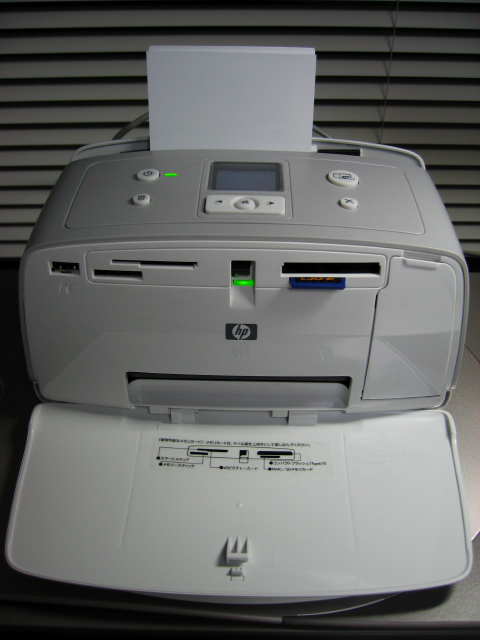HPのプリンタにしては珍しく,背面給紙タイプ。メディアは,SD/CF/MD/MS/xD/SMの各種に対応しています。メディアスロットに挿すと,パソコンにもマウントされ,カードリーダ代わりにも使えるのは便利。ただし,転送速度はやや遅いっぽい。