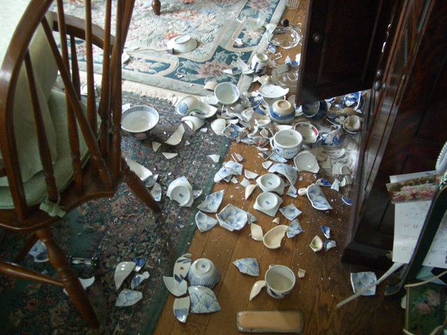 いやー,参りました。よりによって帰省中に地震@福岡西方沖に遭うとは。まぁでも,M6弱という震度の割には(街中の)被害は一部地域を除いてそれほどでもなかったので,不幸中の幸いといったところでしょうか。ちなみに,下の写真は我が実家の被害状況。