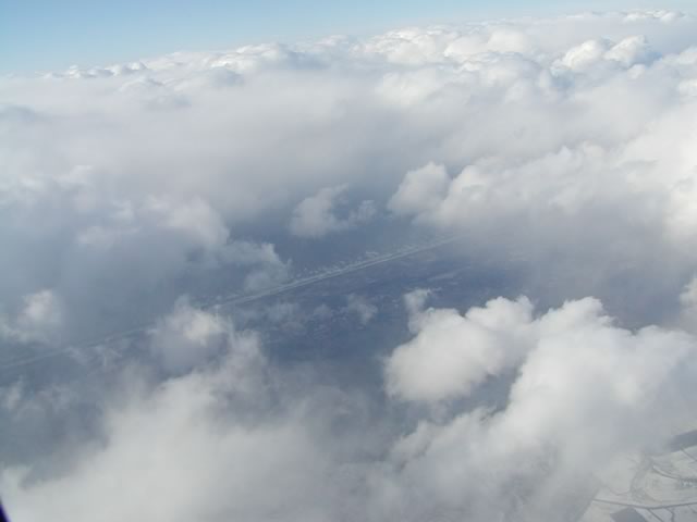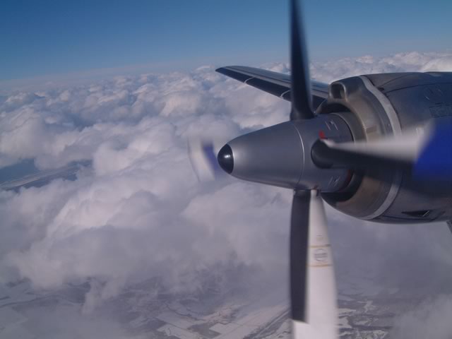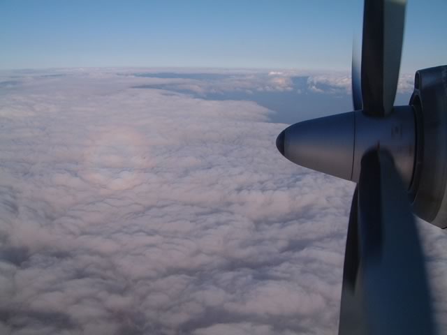 ちょっと分かりにくいケド,プロペラに光が反射して,雲の上に,虹みたいな模様ができています。