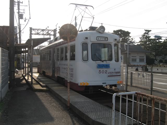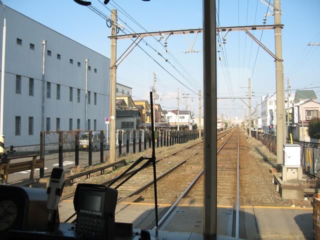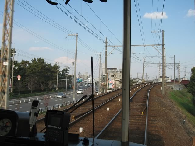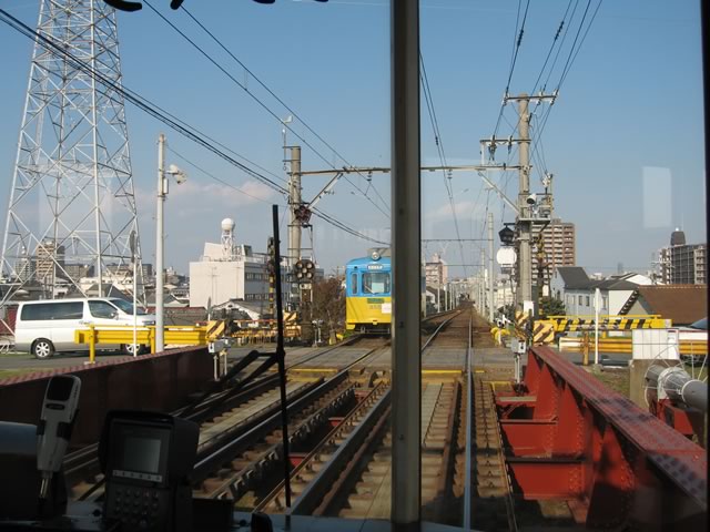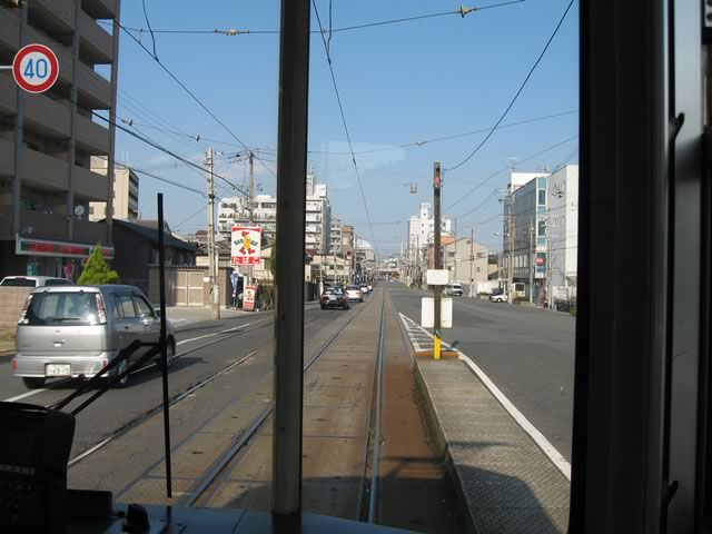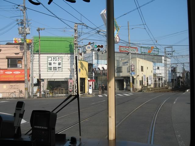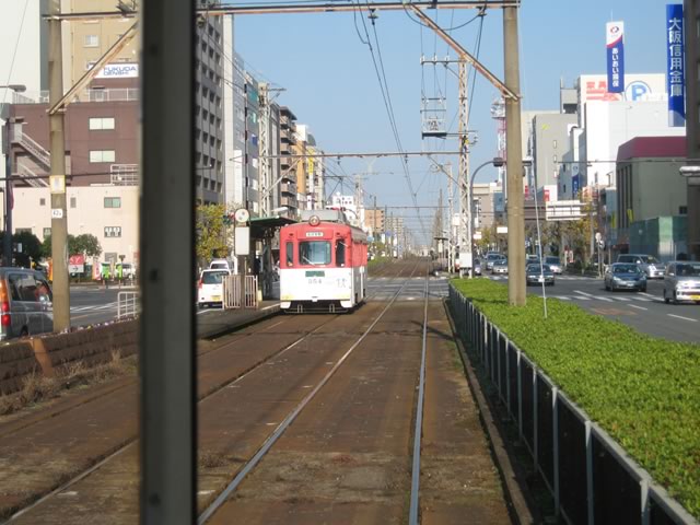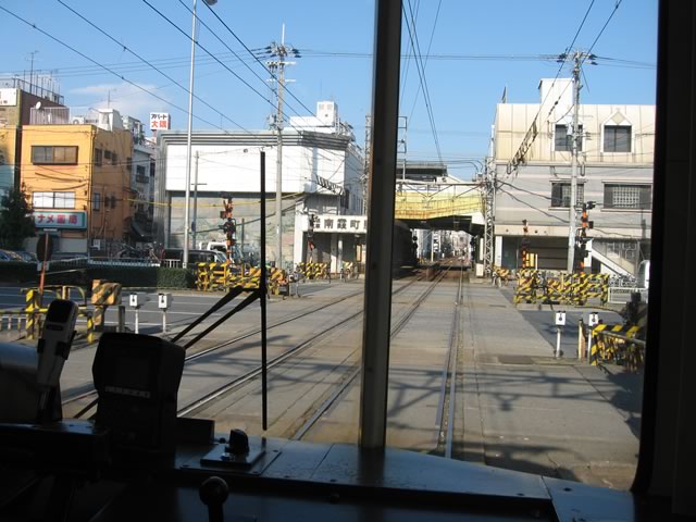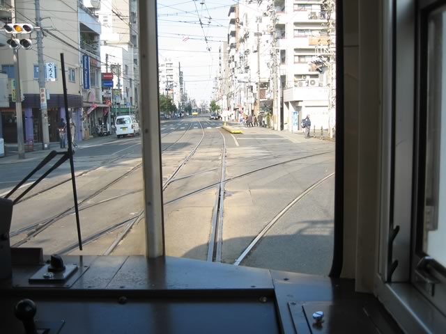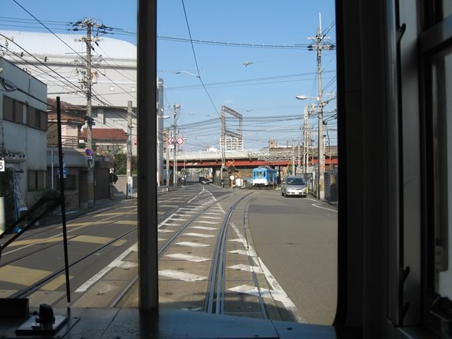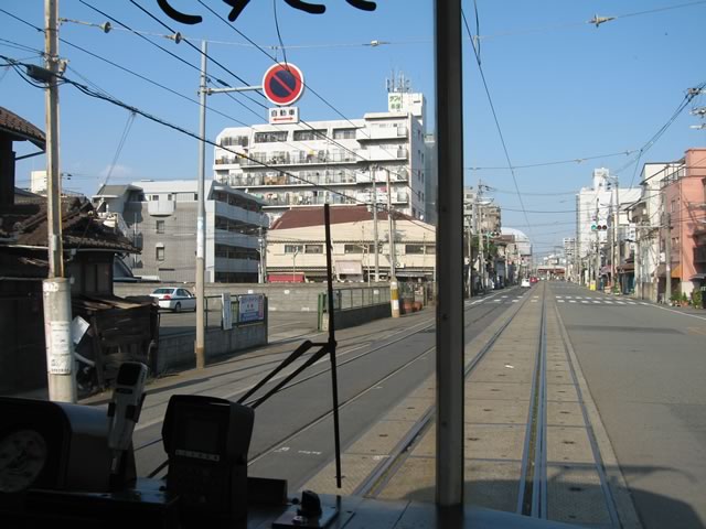 天神ノ森駅を過ぎると,併用軌道に入ります。いやー,本当に車道と“併用”していますなぁ。