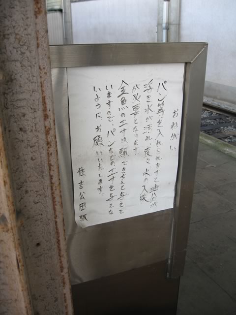 住吉公園駅のホームでは,なぜか金魚が泳いでいました。「エサをきちんと与えているので,パンなどを与えないで」の一文に笑ったかも。