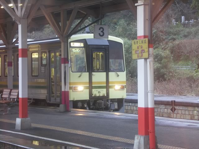 三江線の直通列車と行き違い。相手はキハ120のミニ気動車。