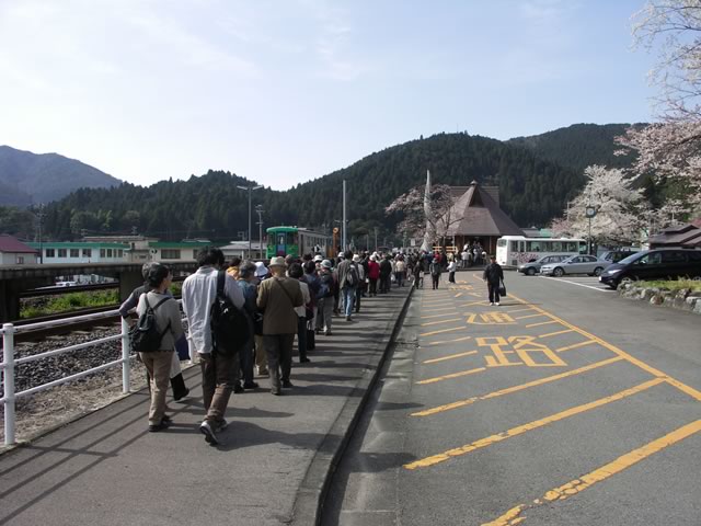 そして終点樽見駅へ。見よ,この行列〜。二両編成の列車に全員乗りきれたのかな…。