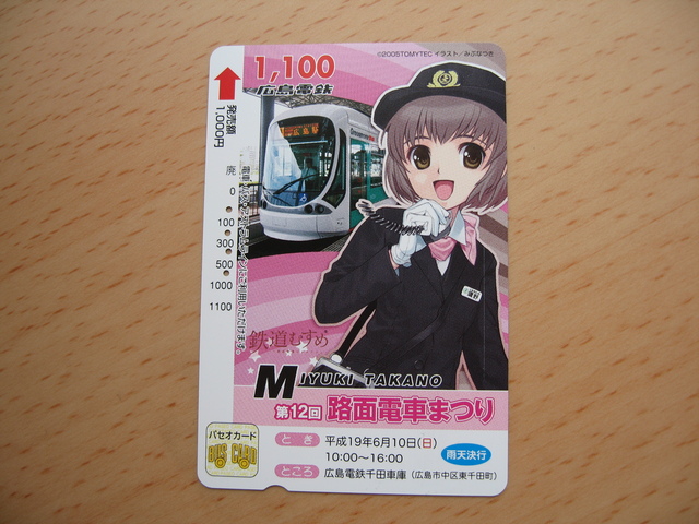 病院に入院している父親の見舞いのため昨日も広島へ。市電沿いに病院があるので,広島駅からはいつも広電を使っているのだけど,プリペイドカード(広島ではパセオカードというらしい)がちょうど切れていたので,電停の券売機で1,000円のカードを買ったのですねー。すると,こんなのが出てきてびっくり。前回買ったときは何の変哲もない犬の写真だったのにさ〜(^ ^;)。どーやら,6月10日に開かれる第12回路面電車まつりを記念して発行された限定カードみたいですね(ソース)。しかしまぁ何というか,公衆の面前で取り出すのが少々恥ずかしいデザインではありますな(笑)。“鉄道むすめ”というキャラクターの存在は知っていたのだけど,こんなところで展開されているとは予想外だったね。どうせ次の週末も広島行きなので,鉄道むすめ広電グッズ目当てに路面電車まつりものぞいてみるかな。