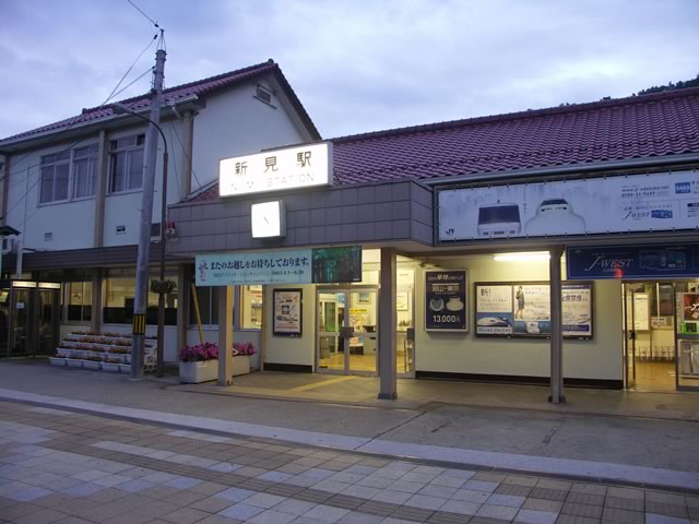 新見駅前,朝5時。なんでこんなに早いのかというと,備後落合駅6時55分発のみよし1号(備後落合−三次間は普通列車)に接続する列車が,5時22分に新見駅を出発するからなのですね。おまけに朝5時に新見駅に着く列車なんてないから,近くのビジネスホテルで一泊するハメになったのですよ〜。