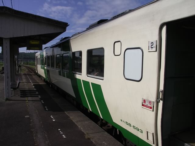 キハ58系を“意識”して乗ったのはこれが初めてだったかな。パワーがないのはともかく,車内の騒音は思ったよりも静かでした。もっとも,窓側の足元は放熱パイプが出っ張っていて狭かったけど。加えて,急行料金を払って狭いピッチのボックスシートに座らされたのも今となってはヨイ思ひ出です(笑)。