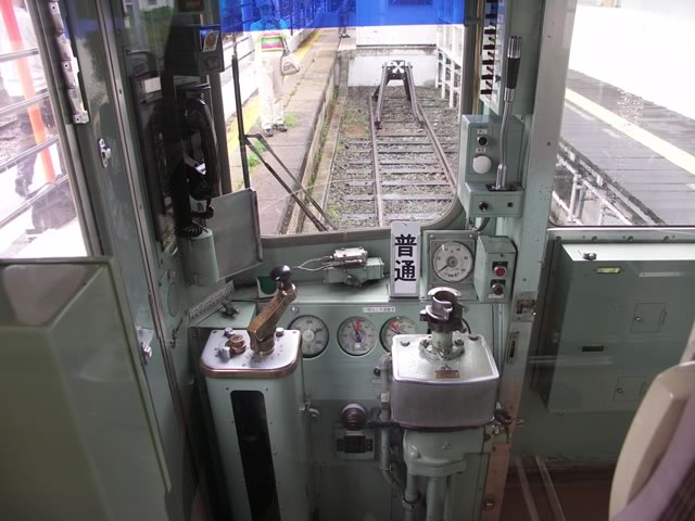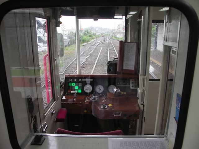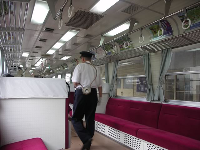 折り返し列車の車内にて。運転士がスタフを持って運転席へ歩いていきます。全区間一閉塞だから儀式的なものだろうけどね。