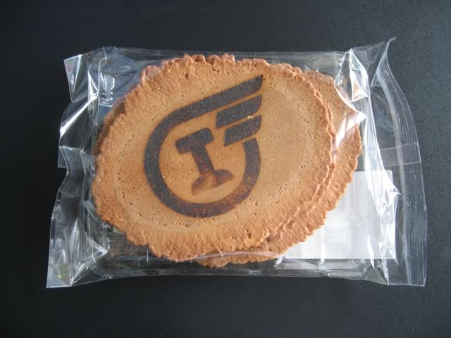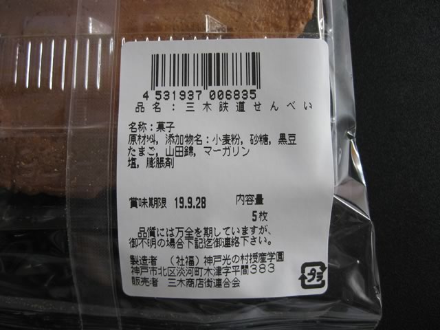 三木駅で売っていた“三木鉄道せんべい”。銚子電鉄のぬれせんべいのヒットに倣ってか,最近はローカル鉄道でオリジナルせんべいをよく売っていますね〜(明知鉄道とかもね)。三木鉄道の社章の入った山田錦せんべいでした(参考記事)。