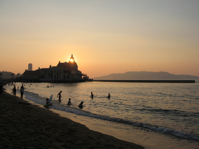 百道浜の黄昏の海(18日撮影)。