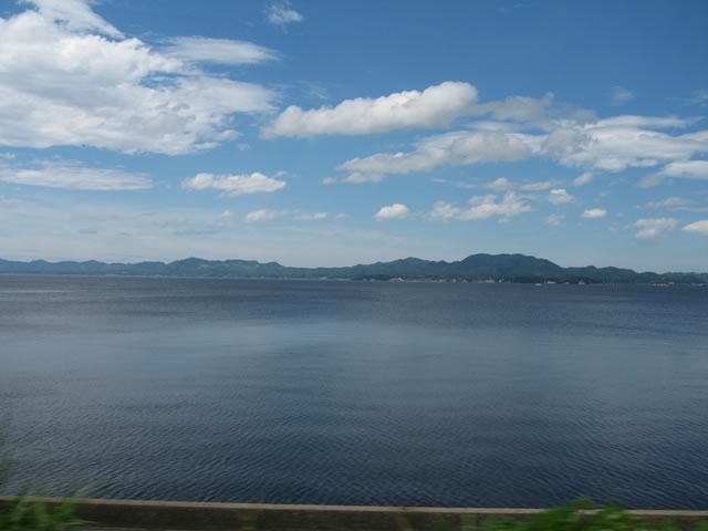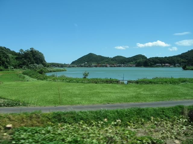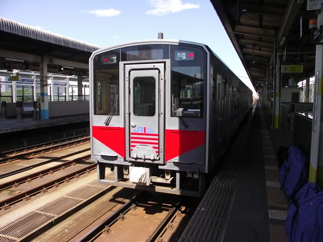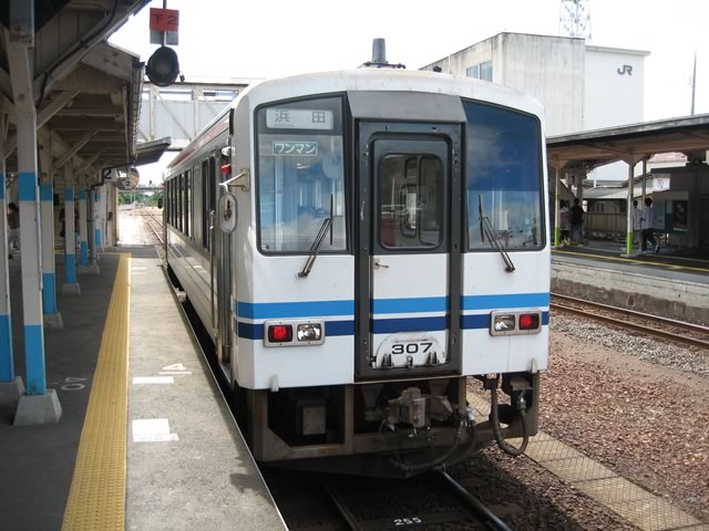 宍道湖(中海?)を進行方向右手に見ながら,玉造温泉を経て列車はやがて出雲市へ。出雲市13:30→江津15:01は,例によってちっこいキハ120系気動車でした。3両編成の電車からいきなり一両の小さい気動車になるので,車内は混み合っていましたね。