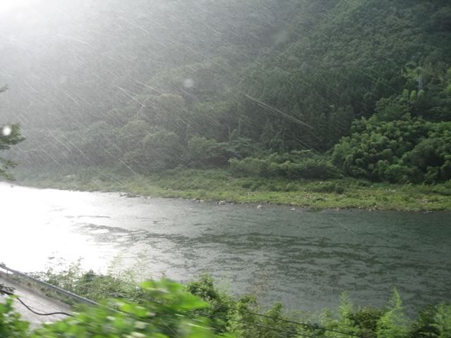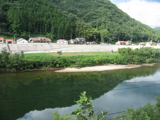 江津駅を出ると,川岸は急に狭くなり江の川が目の前に迫ってきます。しかしまぁ,列車の遅いコト。アチコチに制限30kmが設定されており,もどかしいことこの上ナシ。何でも,80カ所以上に速度制限がかかっている模様(先日の水害以降,さらに増えたらしい)。