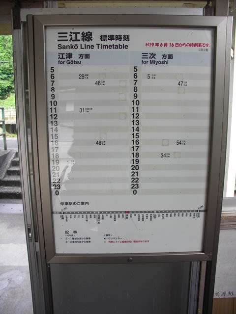 三江線の感想…もうちょっと速くならないのでしょーか。横綱級の閑散路線とはいえ,あまりにも表定速度が遅すぎます。また合理化を極限まで進めているため,弾数(列車)は少ないわ,イヤになるほど速度制限がかかるわ,保線のための運休日があるわで,使おうにも使えなくなってしまってますね。全線が浜原−口羽間の規格で作られていたら,広島から山陰方面の陰陽連絡線としての重要度も増したかもしれないけど,高速道路が網の目のように走っているため,このあたりの主役はもはや…というか最初から高速バスのようです。抜本的に高速化を進めて線形改良するとか,または木次線のようにトロッコ列車を走らせて(ある意味)観光路線に特化するといった手を打たないと,今後生き残っていくのは極めてキビシイのではないでしょうか>三江線。