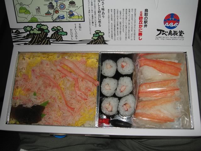 三次駅では3分連絡のため写真は撮れず。跨線橋を渡って移動するのは構わないのだけど,同じホームに府中行きと備後落合行きの列車を止めるのはどうかと。うっかり備後落合行きに乗ってしまいそうになりましたよ〜(誤乗してたらヒサンだったね^ ^;;)。三次18:42→府中20:22,府中20:33→福山21:18,福山21:33→岡山22:32で岡山へ移動。写真は,昼間に鳥取で買った夕食用駅弁です。