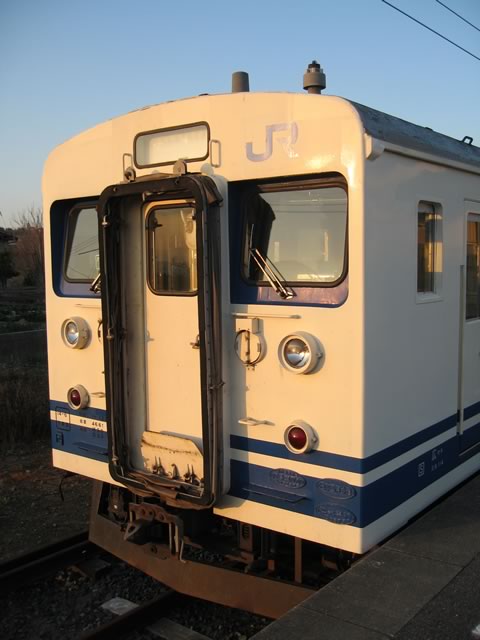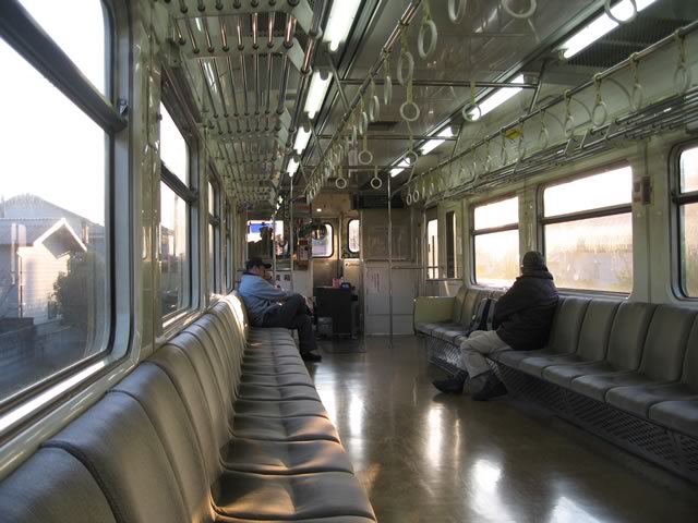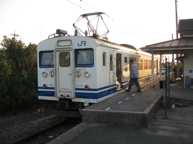 JR西仕様の123系。車内はオリジナルの状態が分からないぐらいコテコテに改造されていますな。ちなみにこのときの乗客は3人。一日20人ぐらいしか(支線には)乗らないらしいので,さもありなんというか…。