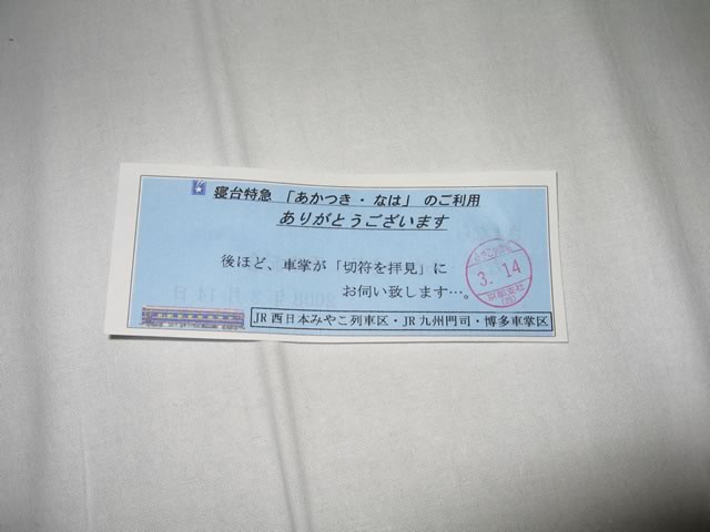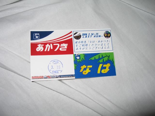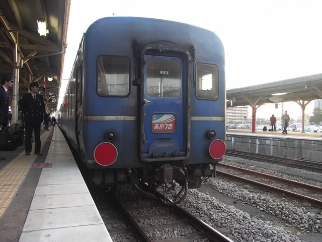 最終日にしてはすこし盛り上がりに欠けていたような…。記念グッズの車内販売もなかったし(記念乗車券は配られたけど)。もっとも車掌のアナウンスはなかなかジーンとくるものがありましたね。親子二代に渡ってあかつき号の車掌を務めてきたらしく,これまで様々なドラマがあったそうで,例えば春には旅立つ子をホームで見送る親をみかけるとなかなか列車のドアを閉められなかった思い出などを話されていました。