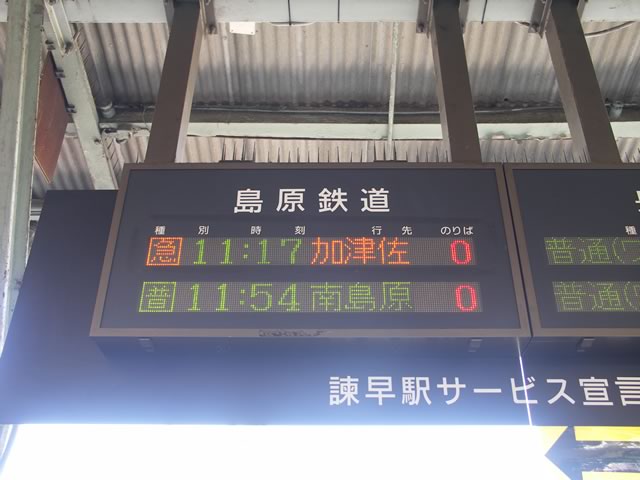 しばらくすると急行加津佐行きがやってきました(写真は方向幕の切り替わる前ね)。もっとも加津佐行きとはいえ,いったん南島原駅で乗り換えないといけないのだけど(おまけに南島原より先は各駅停車だし)。