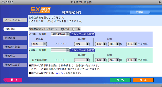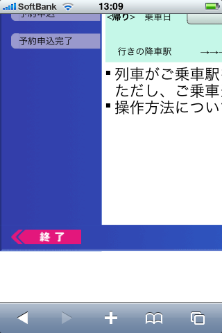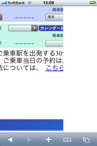 僕はプライベートで新幹線をよく利用するのだけど,その際少しでも安くあげるために東海道・山陽新幹線の会員制ネット予約サービスこと“エクスプレス予約”をいつも使っているのですねー。エクスプレス予約を利用するには,JR西か東海のカードを作らないといけないのが難点ではあるものの,ひこーきと違って発券前であればなんどでも予約変更が可能(ただし予約日時以降の列車)で,かつ自由席の通常料金よりも安く指定席のきっぷが買えるので結構重宝しています。また,「一般的」な携帯からのWeb予約にも対応しており,直近の列車をケータイからさっと押さえられるのもウリなのだけど,なんとiPhoneからアクセスすると,図のように画面右端が切れてしまい,『次へ』のボタンが押せなくなってしまうよーなのです(押せるのは『終了』ボタンだけ^ ^;;)。