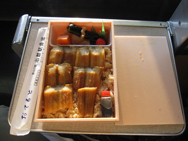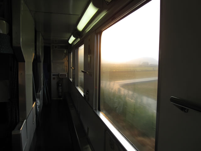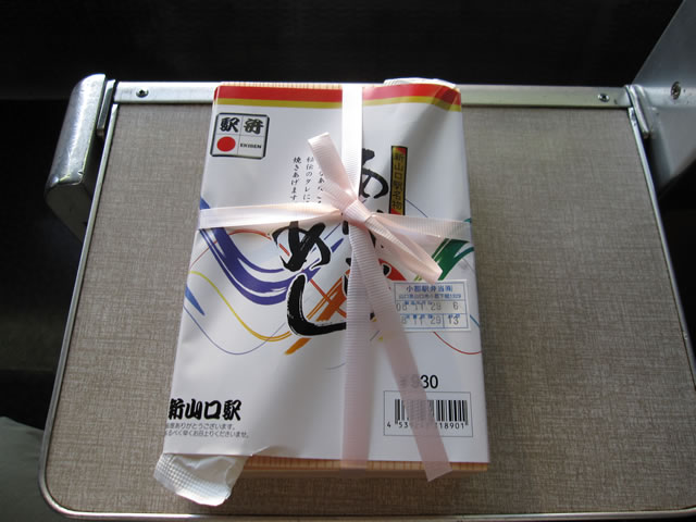 早朝の寝台車。徳山駅から車内販売が始まるので駅弁を買ってみました。最後部の車両だったので途中で弁当は売り切れてしまい,僕が買った駅弁は新山口駅で積み込んだものだったけどね。