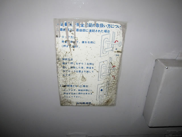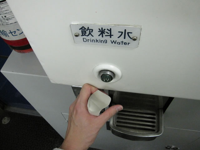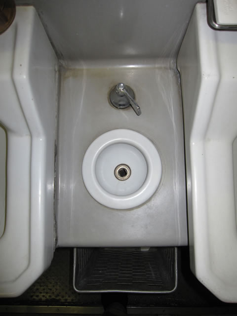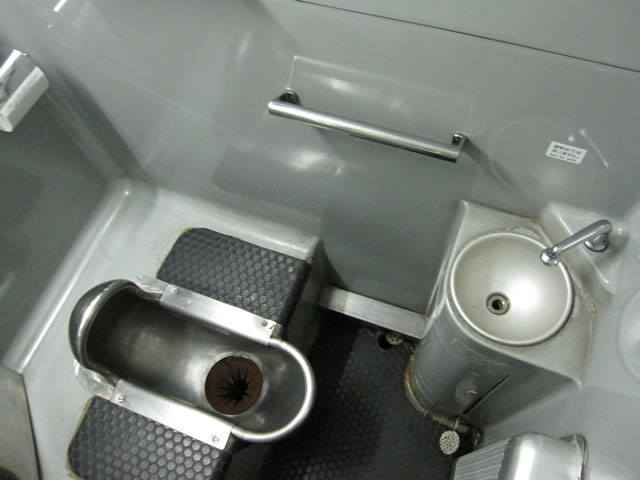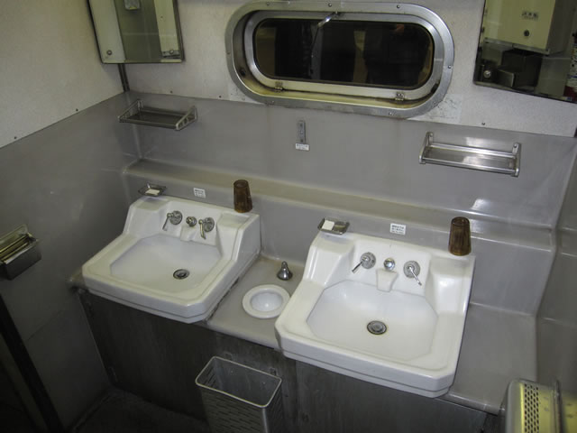 車内設備の写真。車両を寄せ集めたのか,号車によって洗面台回りの作りが異なるようです。ちなみに洗面台の間に見える小さな丸い穴は痰壺だと思われます。