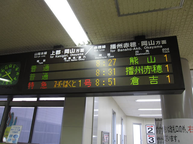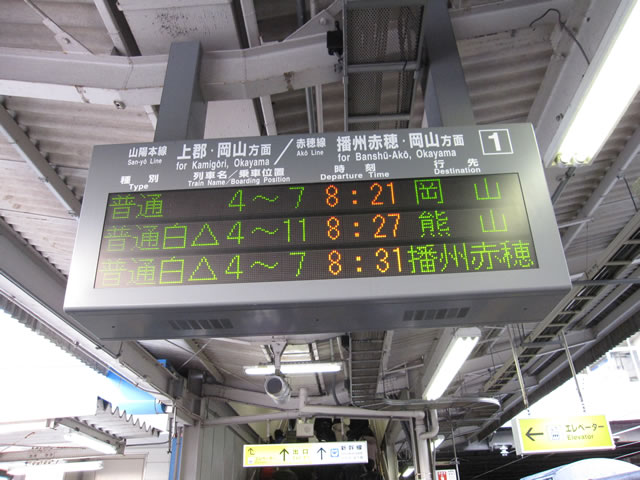 行き先案内を眺めていると,普段は見ることのない「熊山」行き臨時列が表示されたので思わずカメラで撮ってしまった。入試用臨時列車が今日だけ設定されたようです。本当は列車も見たかったのだけど,時間がなかったので…。どの車両が熊山まで行ったのかなー。
