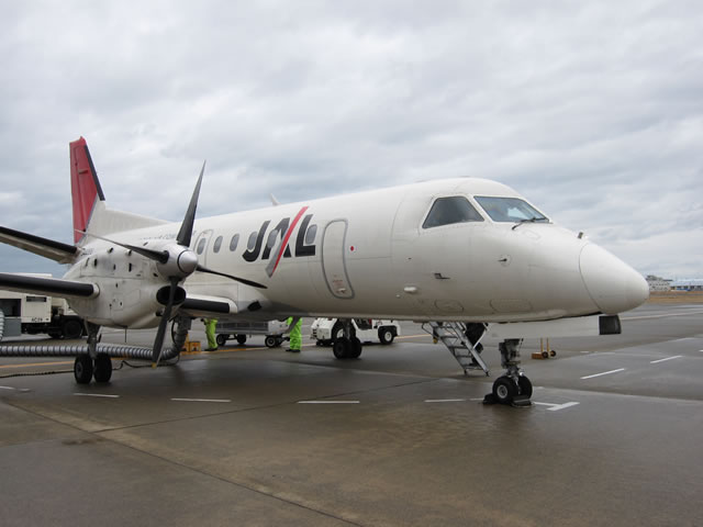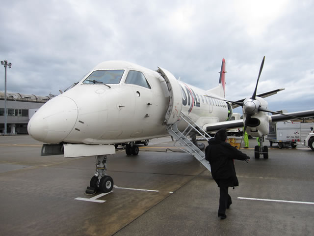 一方,こちらは日本エアコミューターが運行する36人乗りのSAAB340B。徳島から福岡まではコイツに乗りました。サーブにはこれまで何度も乗っているのでそれほど新鮮味はなかったけど,折りからの強風で揺れることx2。つい座席の肘置きを握ってしまいましたよ(^ ^;)。