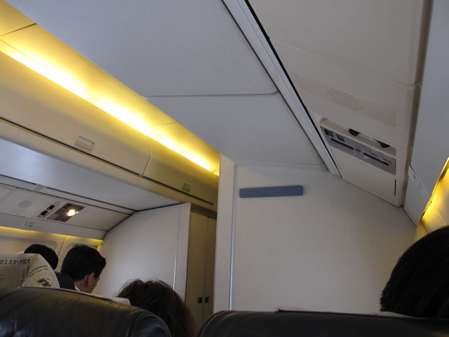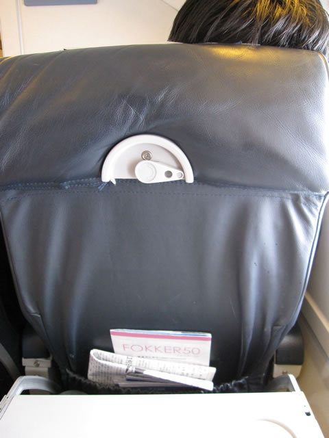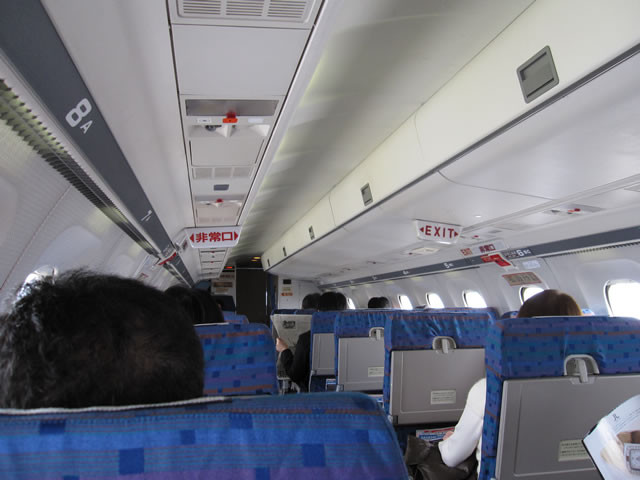 MD-81にも似たやや古めの内装。80年代チックというのでしょーか。革張りのシートだったので,中日本エアラインが最後に導入した特別仕様(定員56名を50人に減らしてシートピッチを広げたバージョン)の機材かな。ちなみに機内は意外と静かでしたよ(降りた後に耳鳴りがしない程度に,ね)。
