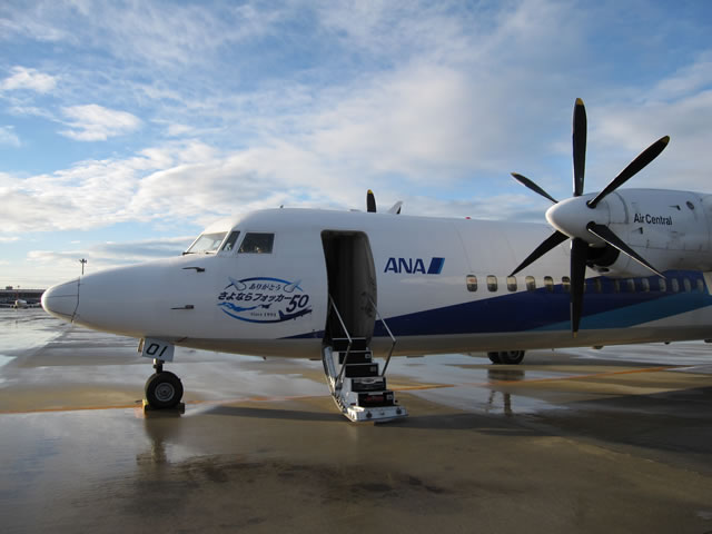 先日も書きましたが,エアーセントラル(旧中日本エアライン)が運行するターボプロップ機“フォッカー50”が1月末で定期便から引退するため,友人の結婚式に出席する“ついで”に乗ってきました(ついでというワリにはかなり遠回りだけどね^ ^;)。最終便は仙台−名古屋(中部国際)線になるけど,さすがにそれでは目的地(福岡)と反対方向になってしまうため,代わりに早朝の名古屋−徳島線に搭乗した次第デス。