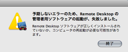 Macサーバ管理者必携(?)なアップル純正リモートコントロールソフトことApple Remote Desktop(ARD)には,遠隔操作ツールだけではなくいろいろと気のきいた機能が備わっていて愛用しているのだけど,私の環境では最新版のバージョン3になってから結構な頻度(一週間に数回)で“落ちて”しまうのです。単に落ちるだけだったらアプリ本体をまた立ち上げればいいのだけど,困ったことにARDがクラッシュすると大抵「予期せぬエラーのため、Remote Desktop の管理者用ソフトウェアの起動が、失敗しました。」みたいなメッセージが表示されてマシンを再起動するまでにっちもさっちもいかなくなるのですね〜。