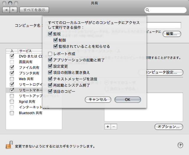 $ sudo chmod 644 /System/Library/CoreServices/RemoteManagement/ ARDAgent.app/Contents/Support/build_hd_index ※実際には改行を入れずに実行