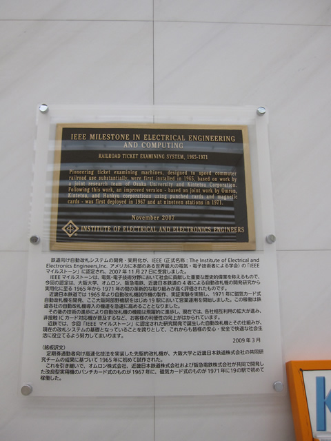 阿部野橋駅には,日本最初の自動改札機導入を記念するIEEEマイルストーンの銘板が掲げられていました。