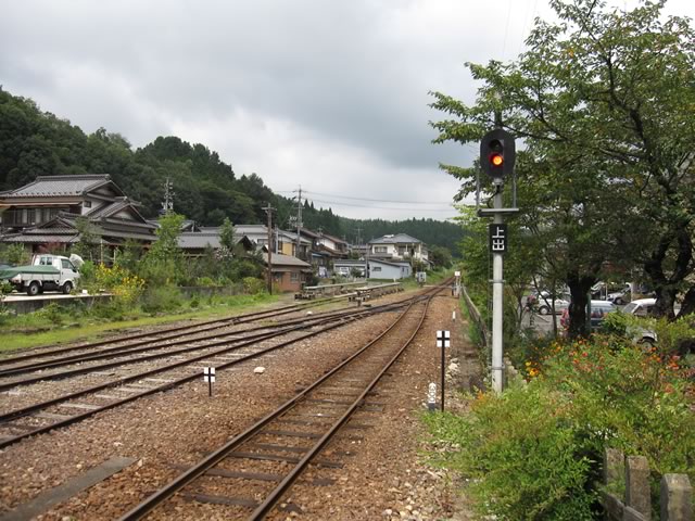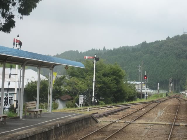 岩村駅で列車行き違い。駅構内には,2004年まで使われていた腕木式信号機が残っています。