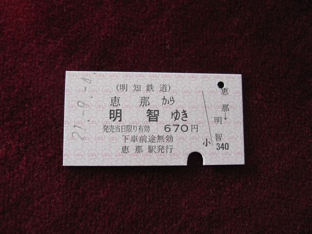 ここでは硬券がフツーに売られていますね−。終点の明智駅では,使用済の硬券が20円で販売されていました。