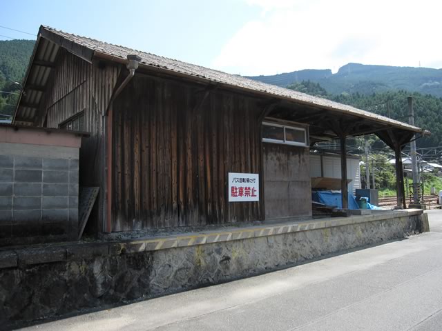 中部天竜駅を出るとバスの停留所が。国鉄バスの標記もかすかに残っています。