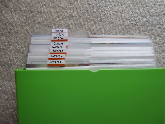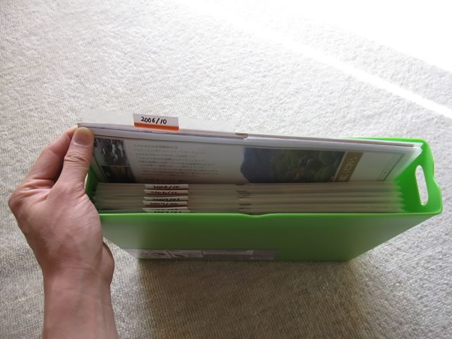 私の場合,付属のシールに旅行に行った日付を書いて各クリアファイルのタブに貼り付け,時系列に並べています。これで,デジカメの写真の日付を手がかりに,当時のパンフレットを探すといったことも簡単にできます(もちろん,地域別や分野別に分けるというのも手ですよ〜)。テプラなどのラベルプリンタをもっていれば,シールに印字してタブに張っておくともっと見栄えがするでしょうね。