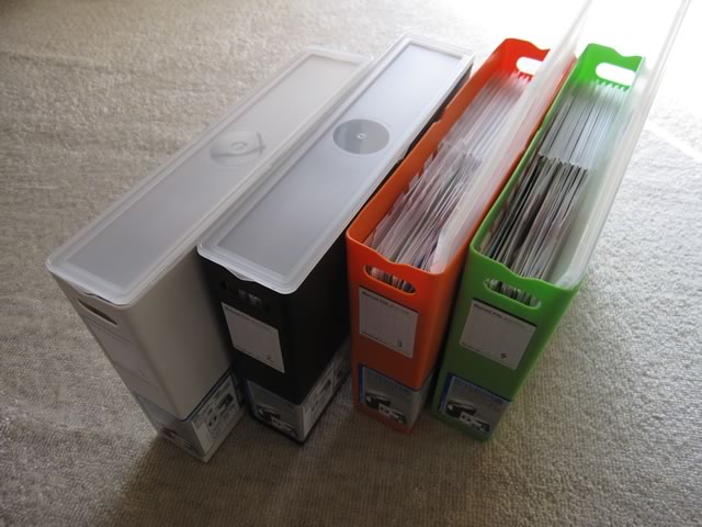 旅行先でもらうパンフレットや入場券などのチケットはサイズがマチマチかつ量(厚み)もバラバラなので,A4以上は折りたたむことを前提に考え,キングジムの「スキットマン 説明書ファイル ボックスタイプ」に収納することにしました。この製品はプラスチックのボックスに10枚のポケット付きフォルダが入っており,タブに見出しを書くことで中身を簡単に識別することができます。元々説明書や保証書とCD-ROMを管理するための事務用品といった位置付けみたいだけど,旅行パンフ等の整理にもちょうど具合がいいのです。A4サイズのクリアファイルの横にポケットがついているのでチケットなどの小物を入れるのに都合がいいし,必要に応じてクリアファイルを追加することも可能なのも○(もっともファイル自体に厚みがあるので,追加の余地はそれほどないケド)。