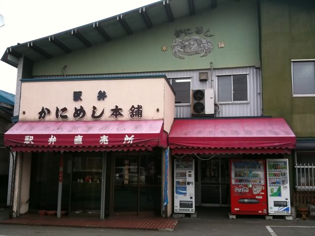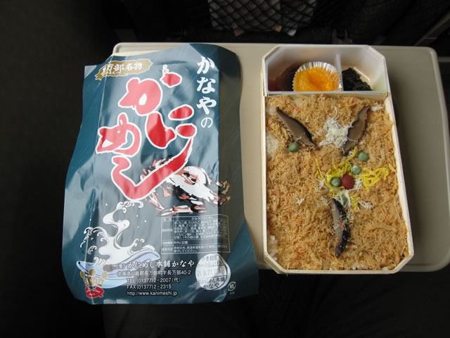 そして札幌から4時間以上かけ,長万部駅に到着。駅の近くになる弁当屋で名物の「かにめし」をゲット。函館行の特急北斗号の車内で食す。