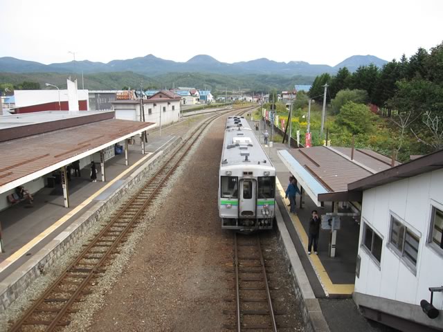 倶知安駅で待ち合わせ停車。ホームの駅そば屋はもぬけの殻(駅舎内で営業しているようです)。