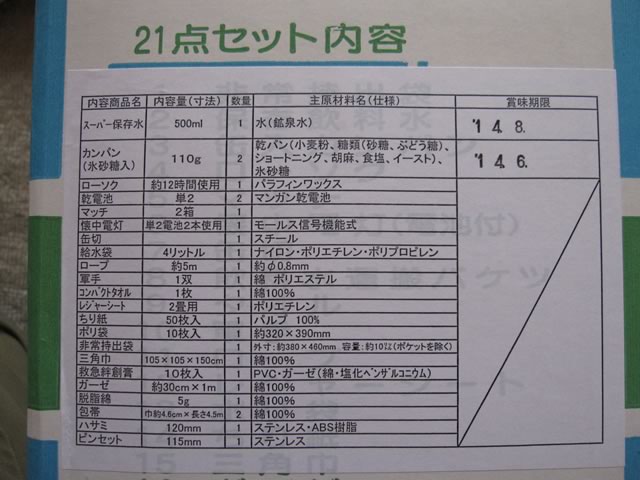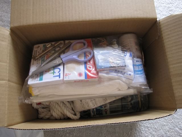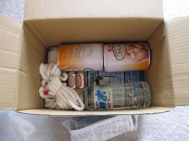 送られてきた非常袋セットには21点のアイテムが含まれており,長期保存が可能な水や缶詰に入った乾パン,懐中電灯,水汲み用の袋,マッチ,缶切り,ハサミ,軍手,ピンセット,ガーゼ,絆創膏,ロープなど緊急避難時に役立つ品々が入っていました。後は簡易トイレとヘルメットなどがあれば,2・3日の「非常事態」には対応できるのではないかな。もっとも,電池などは徐々に劣化していくので,使いたい時に使えない事態を防ぐためにも定期的な点検が必要なのだろうけどね。