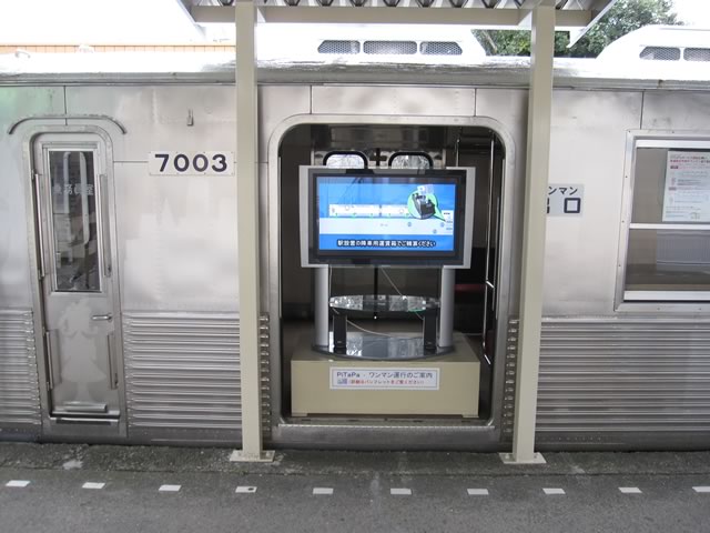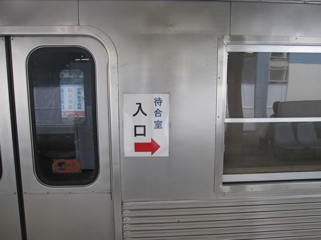 ホームにすでに列車が止まっているなー,と思ったら何と待合室代わりに留置している車両でした。何でも本来の待合室が工事中のため,車両を開放しているようで。