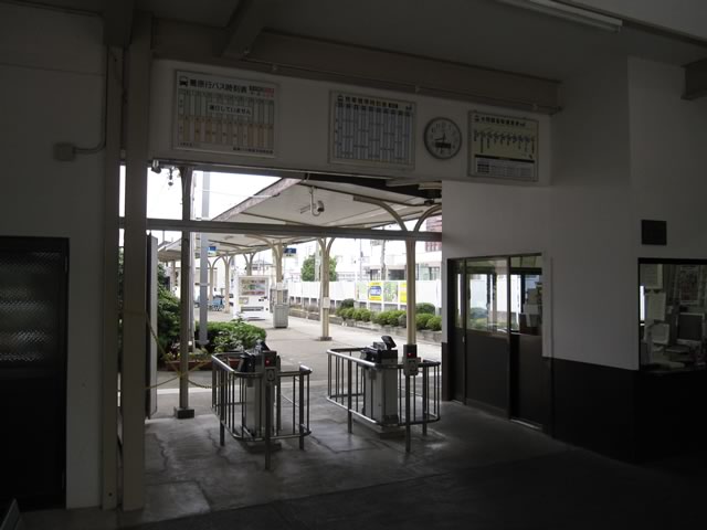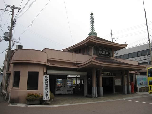 15分ほど揺られると終点水間観音駅に到着(今年の6月1日に改称する前は水間駅)。コチラの駅は水間寺の入口ということもあってか,寺院風な外観ですな。