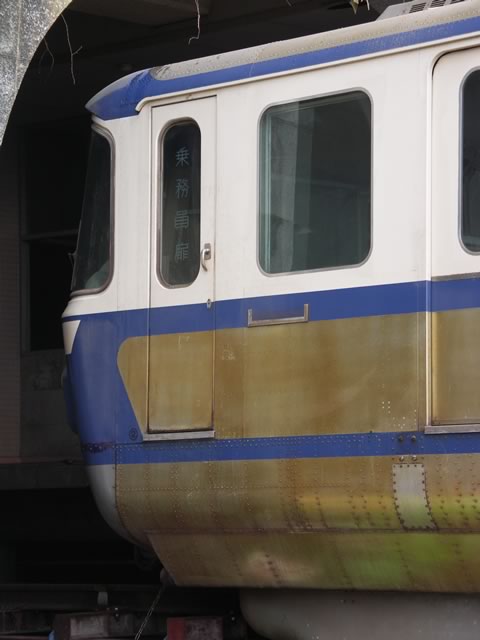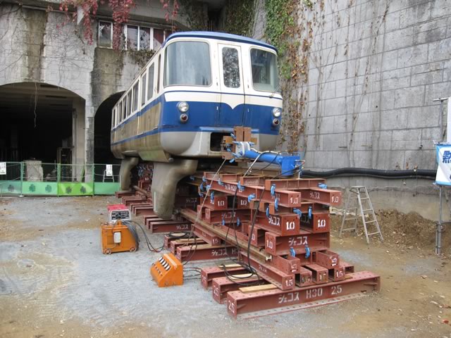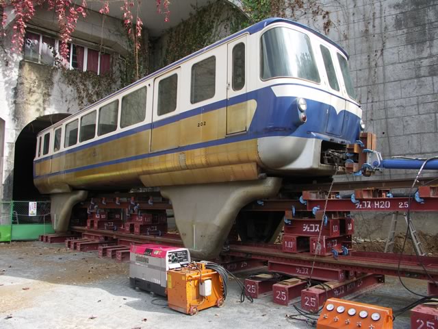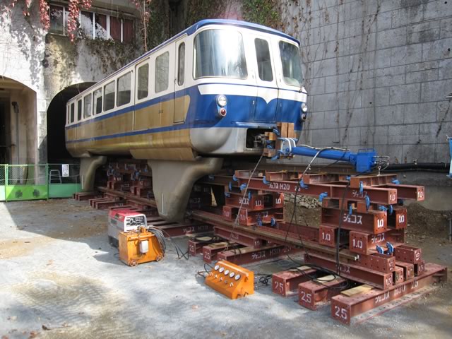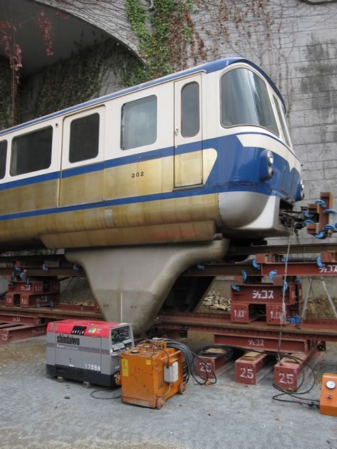 1966年から1974年までのわずか8年間のみ運行された旧姫路モノレールの車両が移動のため35年ぶりに車庫から屋外へと出され,今日一日だけ一般公開されると聞きつけ,旧手柄山駅まで見にいってきました(参考)。