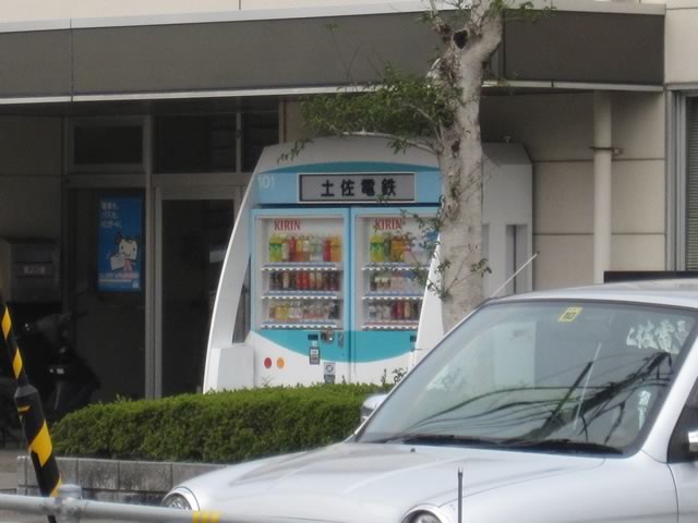 桟橋車庫前まで歩き,車庫を外から「見学」。自販機も新型車両(ハートラム)の形をしていますねー。