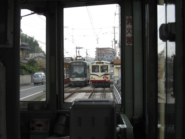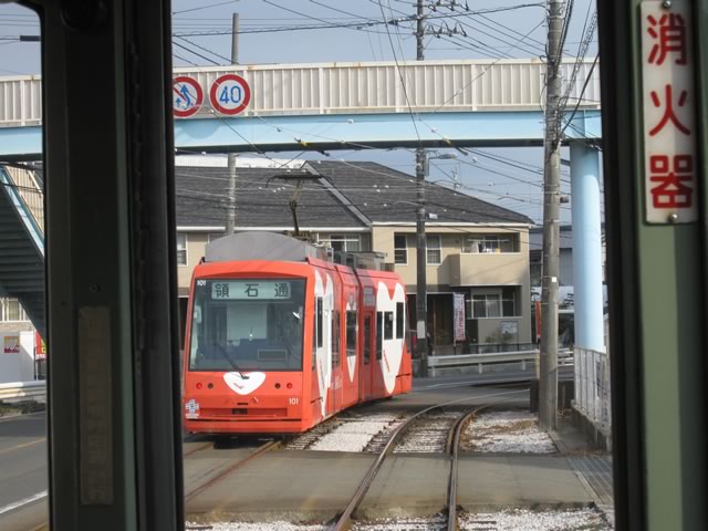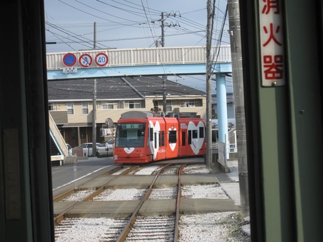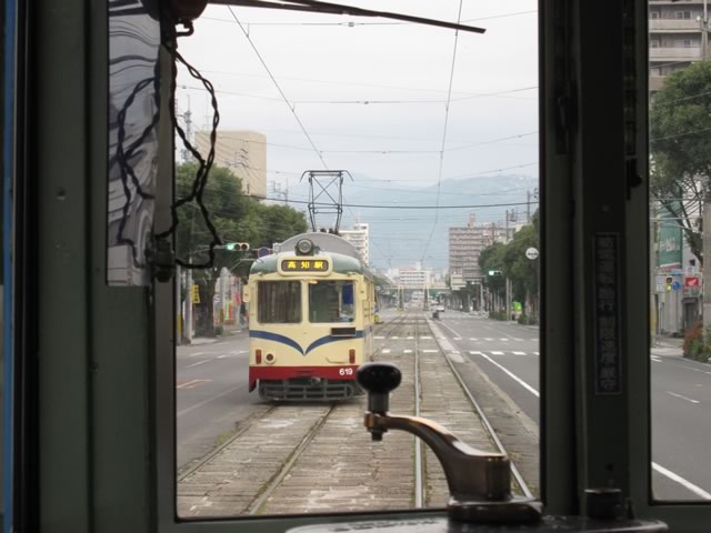 土佐電に一両しかない低床型車両(ハートラム)とすれ違い。