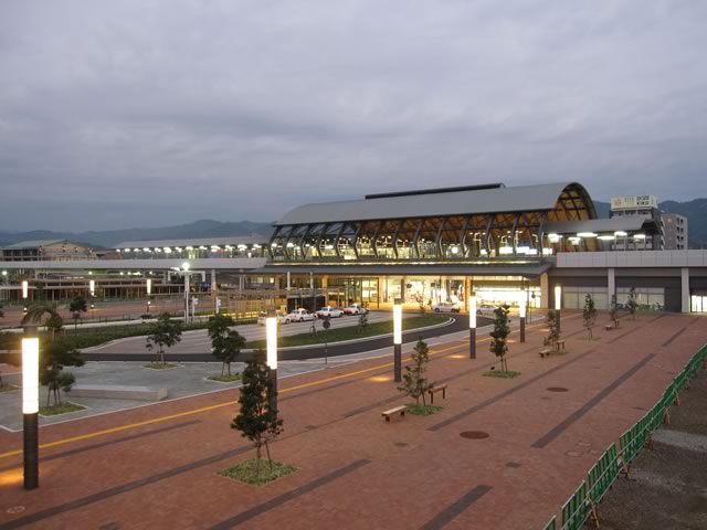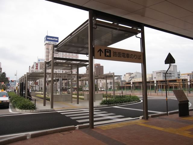 早朝の高知駅前。路面電車はロータリーまで乗り入れています。