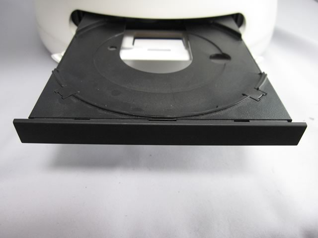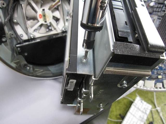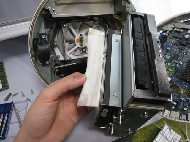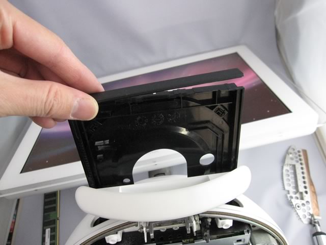 ここで問題発生。ネジを取り外し,ドライブベイを引っ張り出そうとしたところ光学ドライブのフロントベゼルが干渉してビクともしないのですね〜。仕方なく,ここでいったんシステムを起動し,光学ドライブを“排出”(イジェクト)後,フロントベゼルを手で剥がしました。ベゼルは両面テープでくっつていているので簡単に剥がせます。本当は分解前に取っておけばよかったのだけどね>ベゼル。